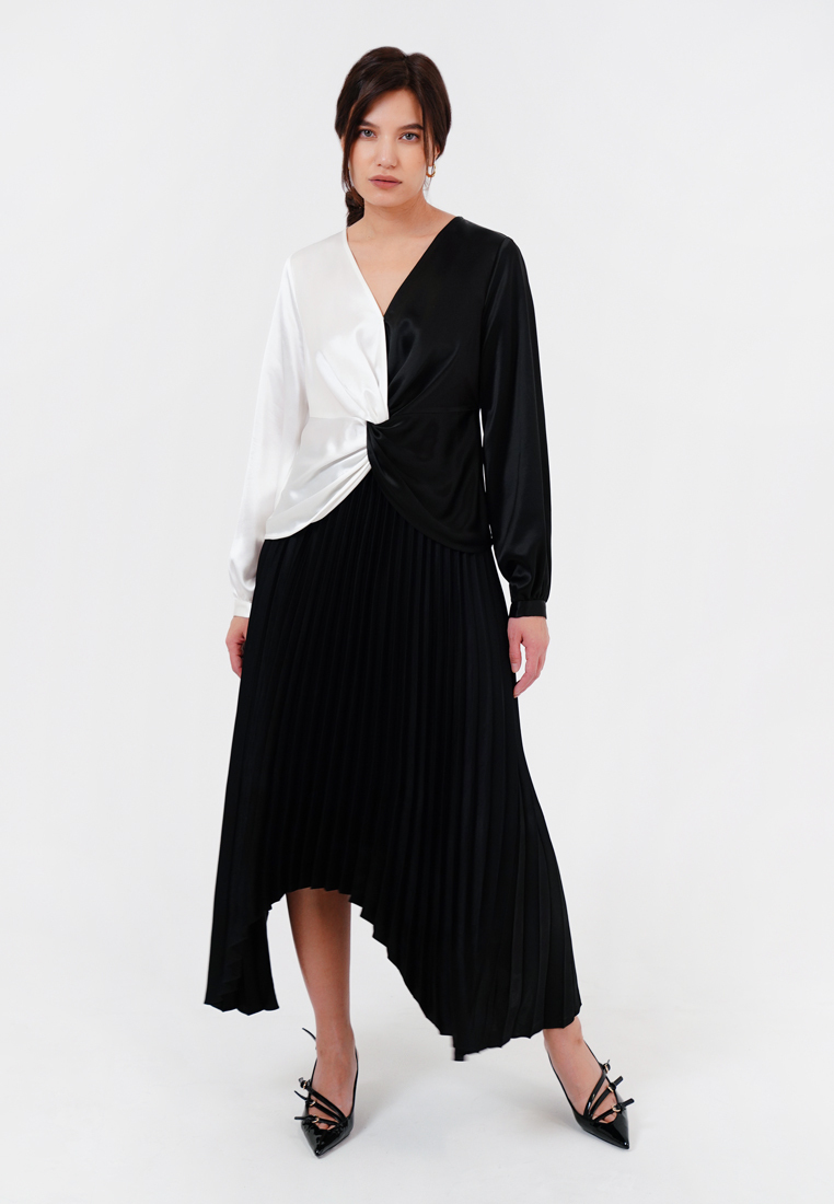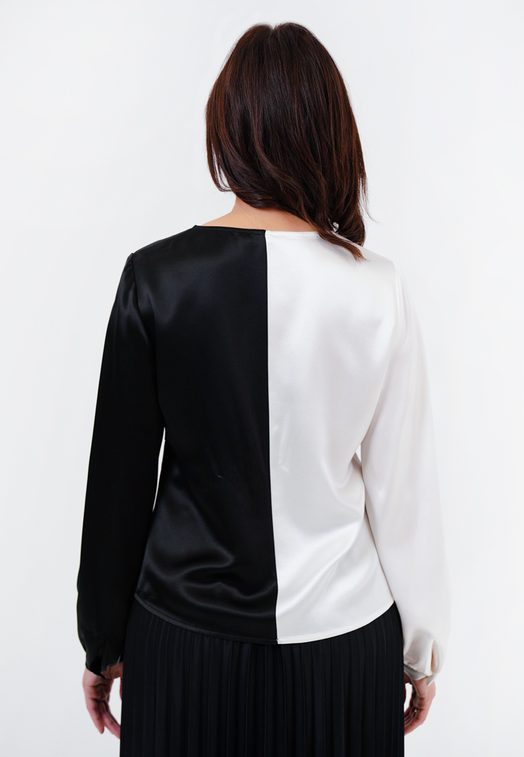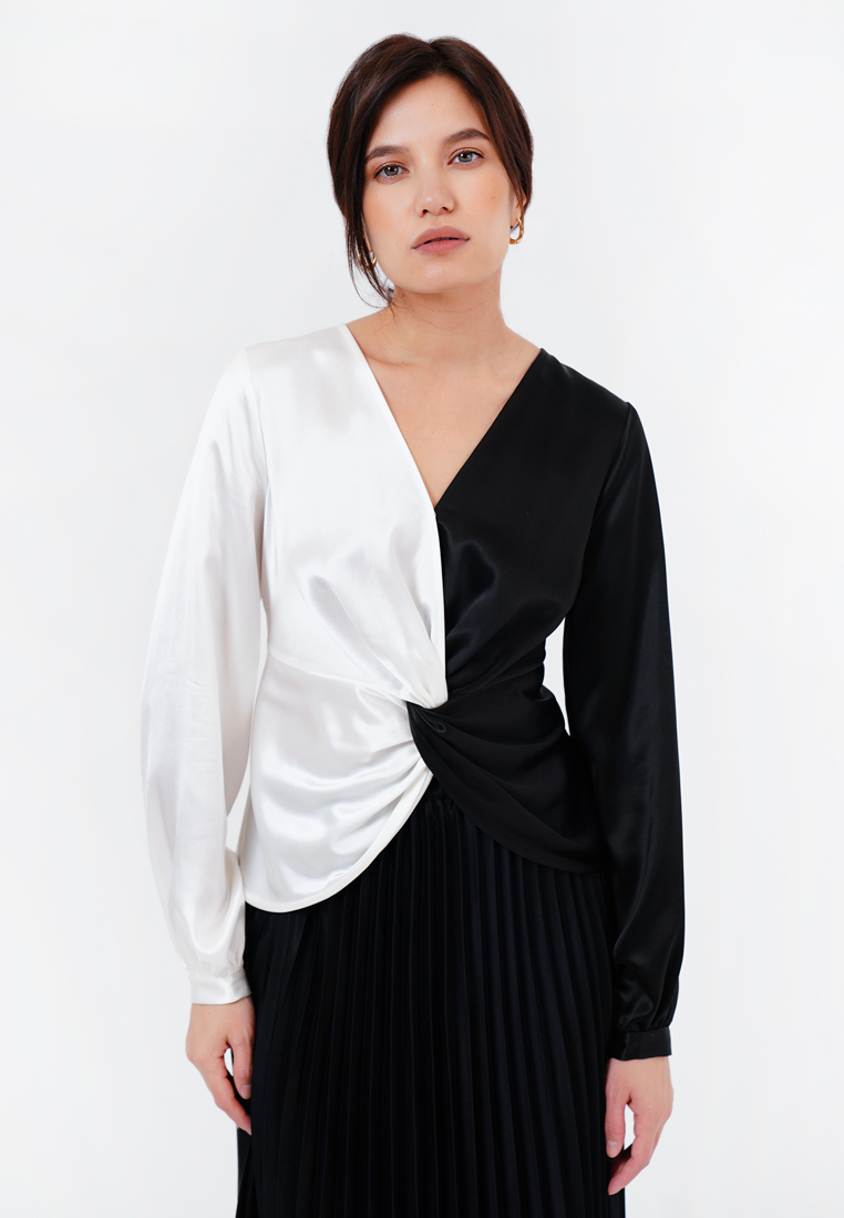 Очень легкая и стильная блуза, двухцветная подкрутка придает образу индивидуальность. V- образный вырез визуально удлиняет шею. Может сочетаться с брюками, юбками-миди и любой обувью.