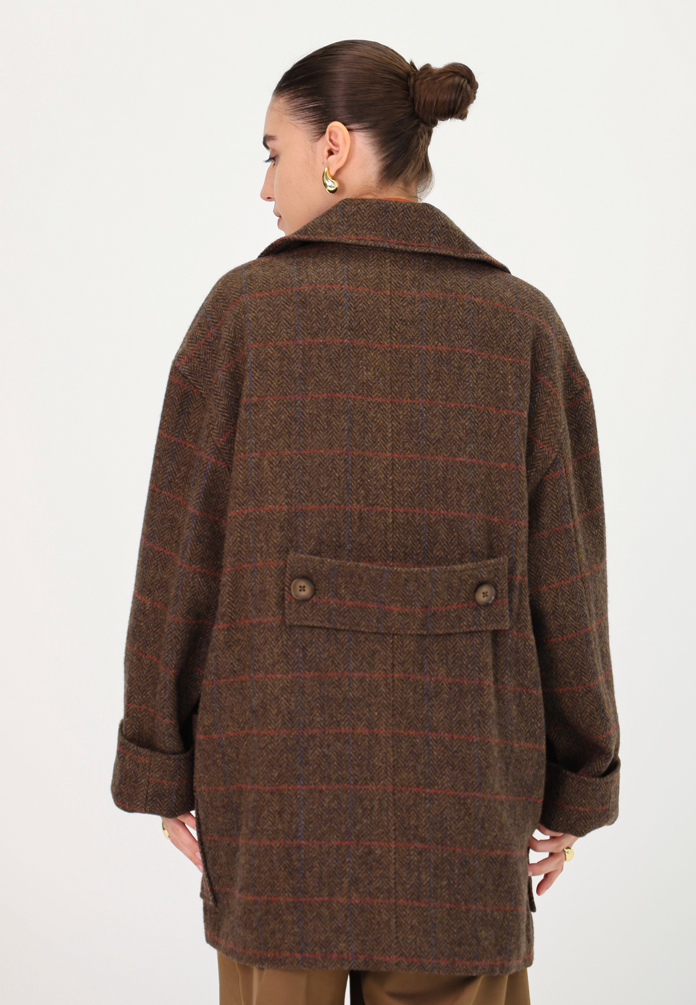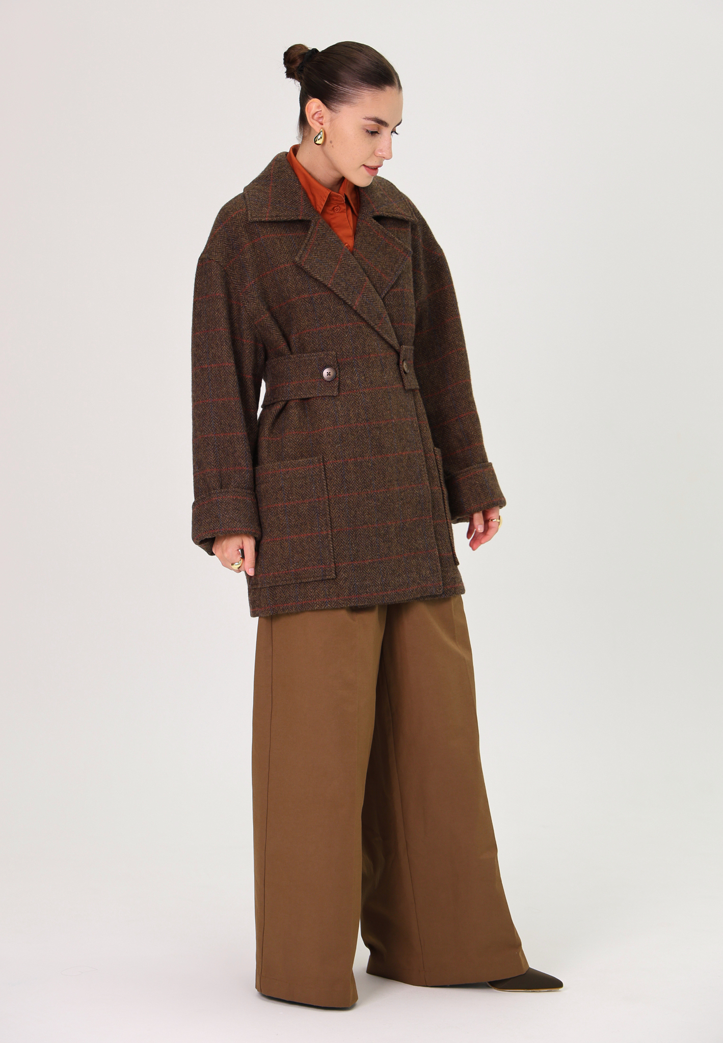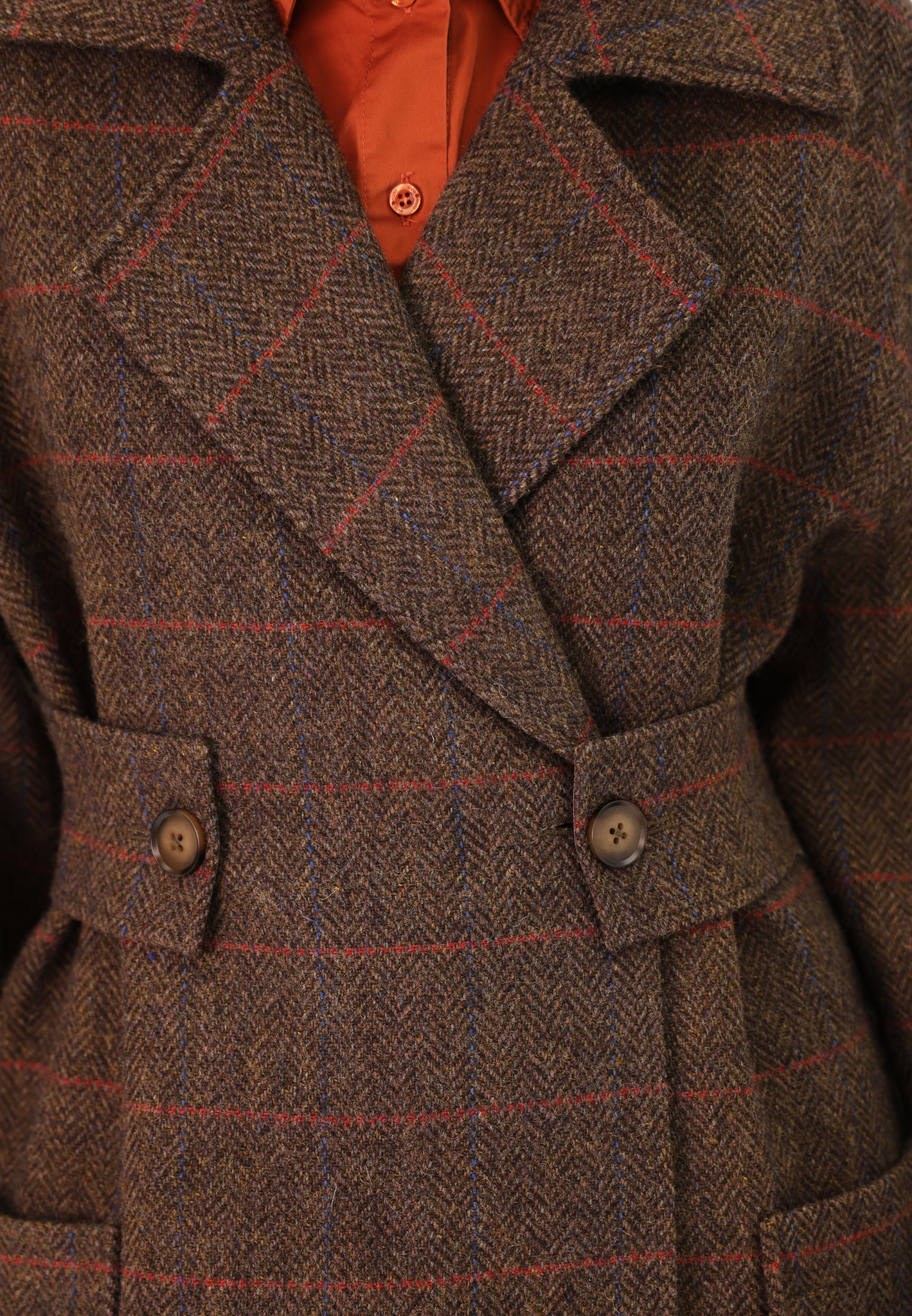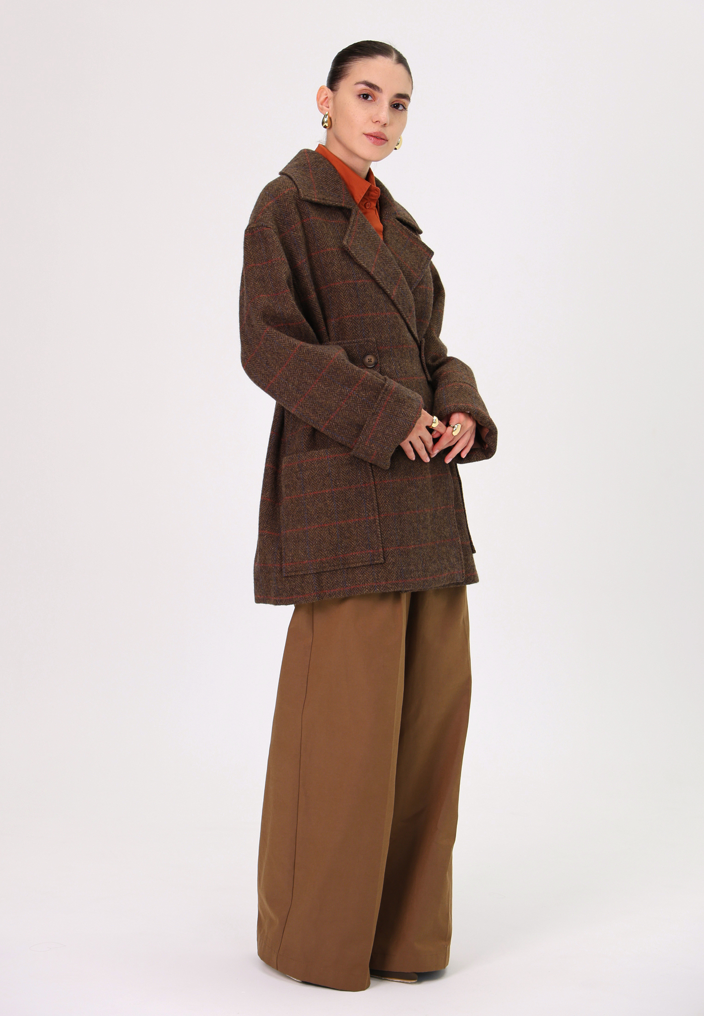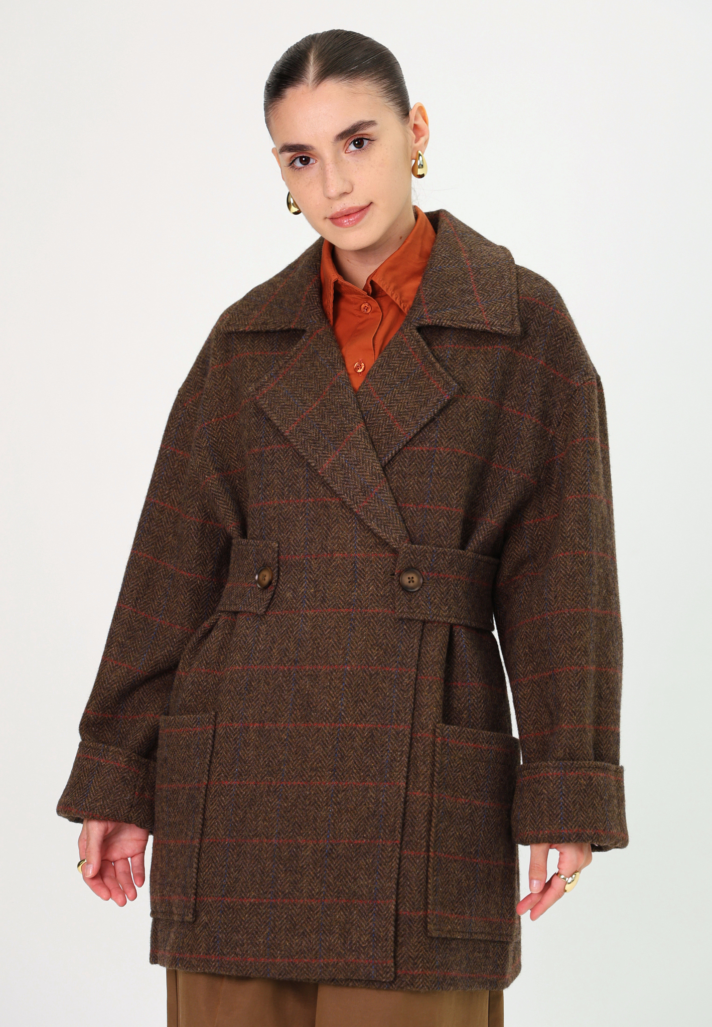 Пальто в клетку — универсальное изделие, которое позволяет создавать разные образы благодаря продуманным деталям. Декоративные и функциональные пуговицы дают возможность менять силуэт: носить пальто в свободном расслабленном стиле или подчеркнуть талию, застегнув его на поясную планку. Объемные рукава с отворотами и крупный лацкан добавляют выразительности, а прямой крой делает модель удобной и современной.