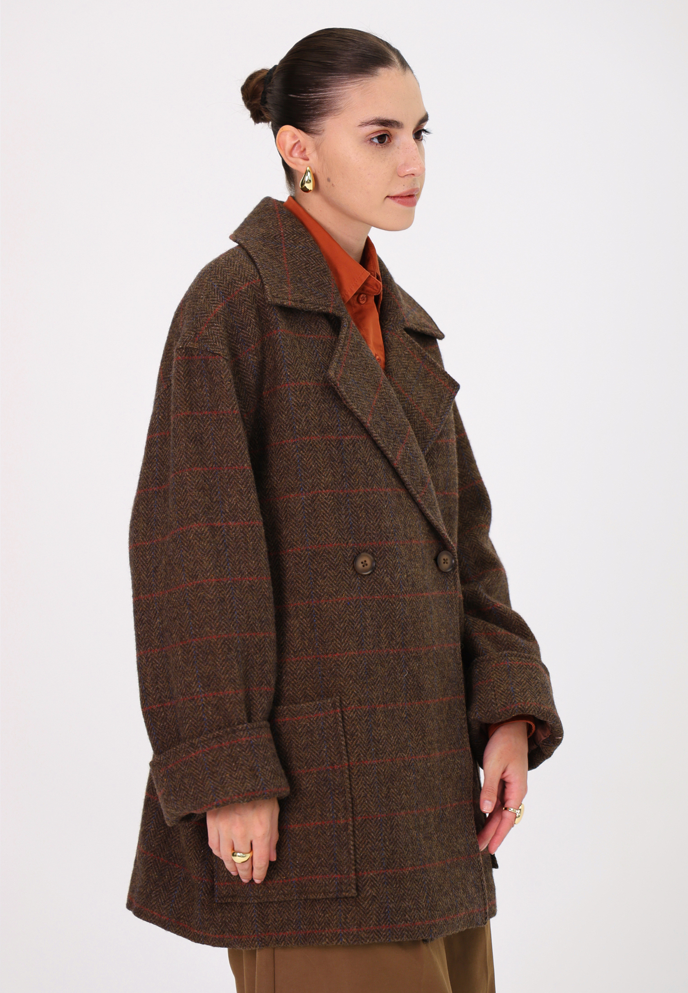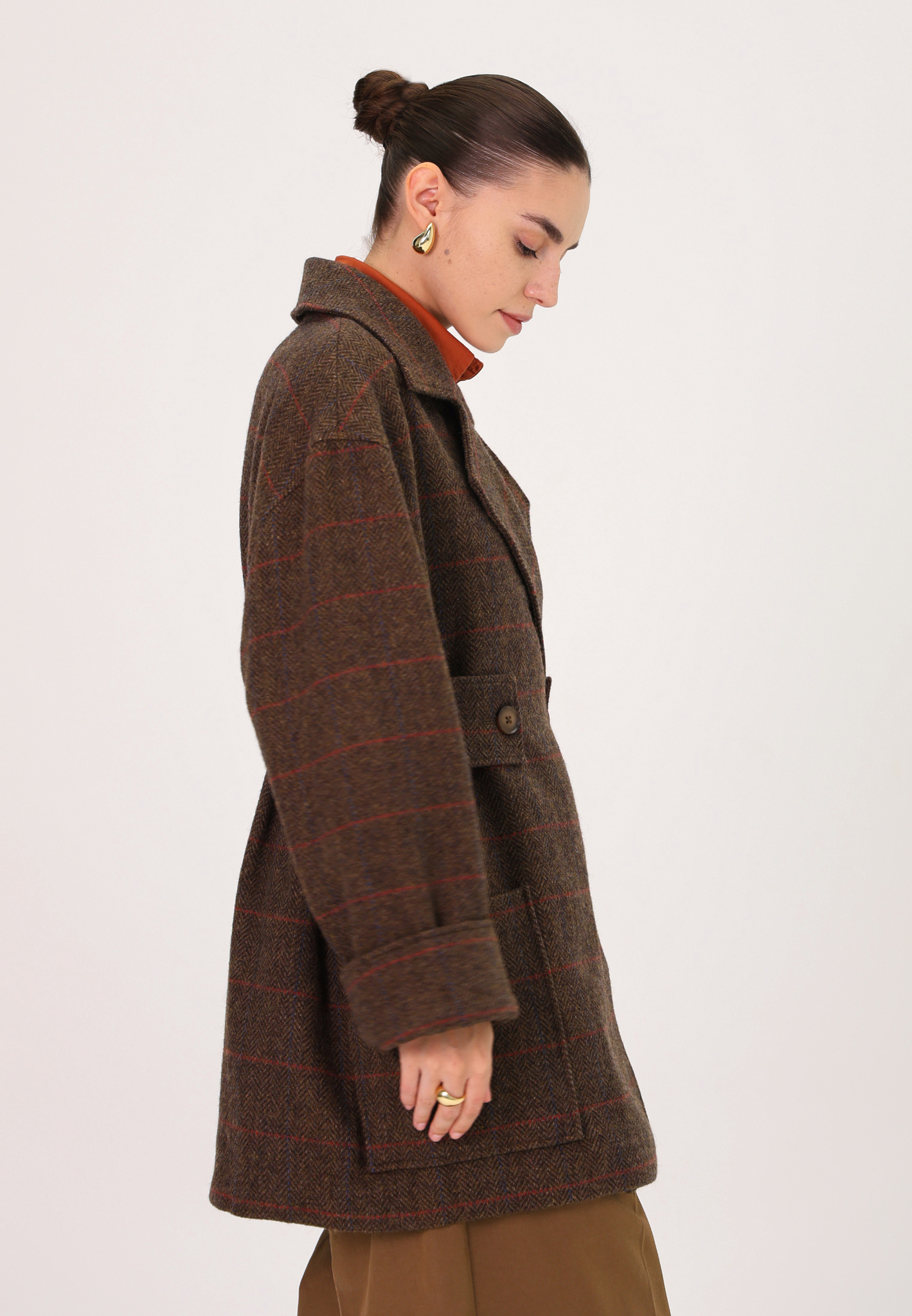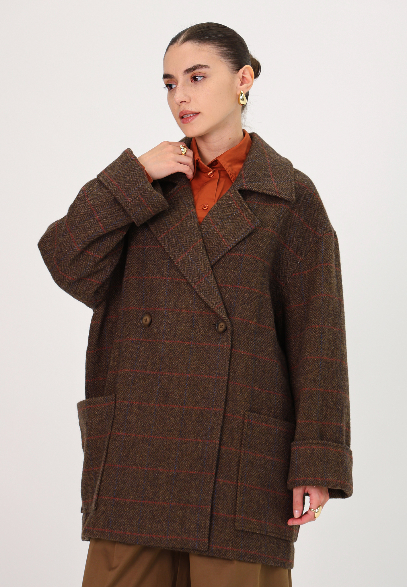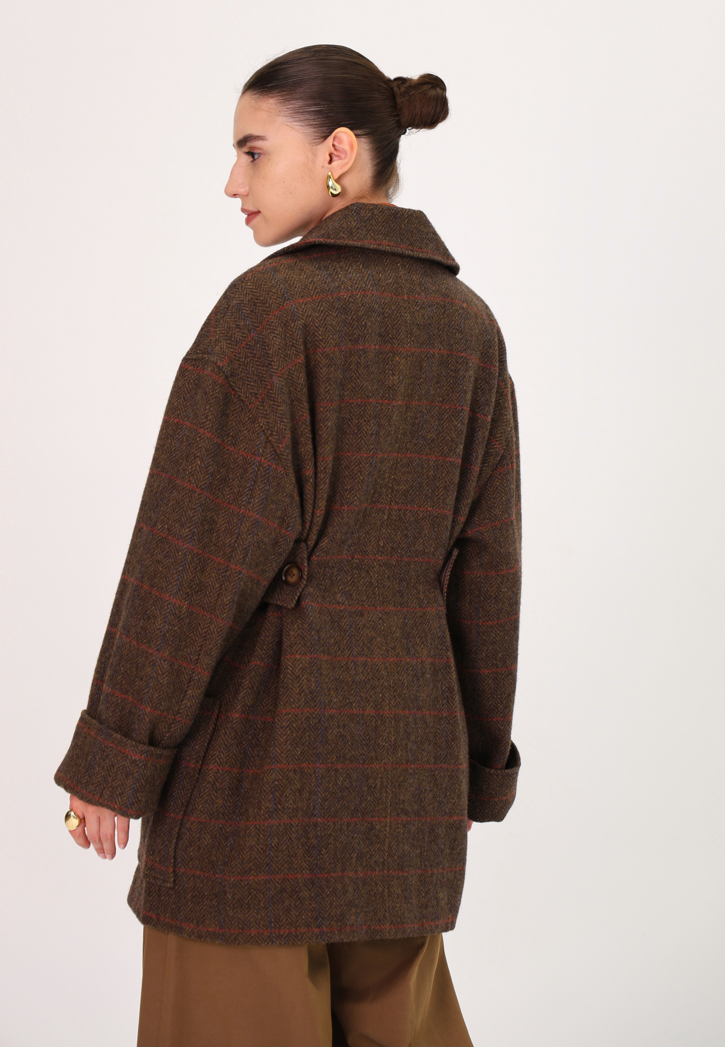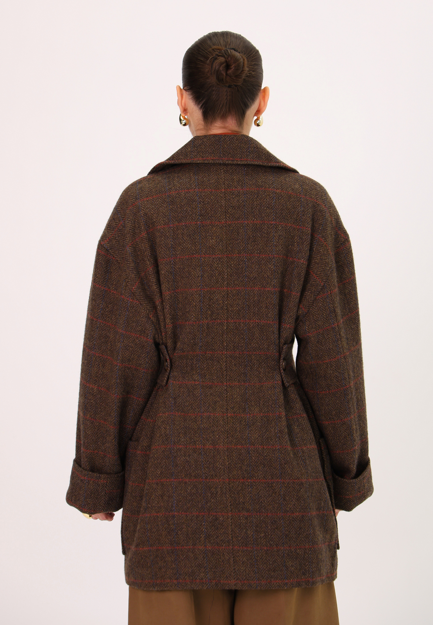 Пальто в клетку — универсальное изделие, которое позволяет создавать разные образы благодаря продуманным деталям. Декоративные и функциональные пуговицы дают возможность менять силуэт: носить пальто в свободном расслабленном стиле или подчеркнуть талию, застегнув его на поясную планку. Объемные рукава с отворотами и крупный лацкан добавляют выразительности, а прямой крой делает модель удобной и современной.